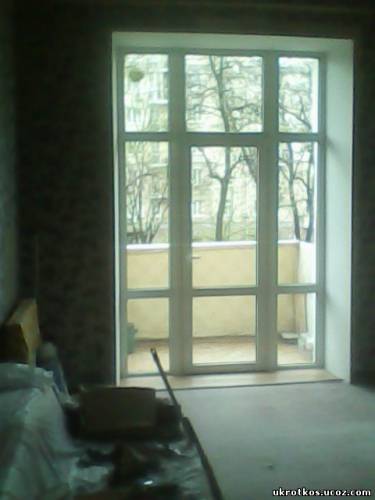 Выход на балкон. Откосы из гипсокартона с утеплением пенопластом. Окрашены белой водоэмульсионной краской. Размеры 1860х2650. Порог выполнен из ламината.